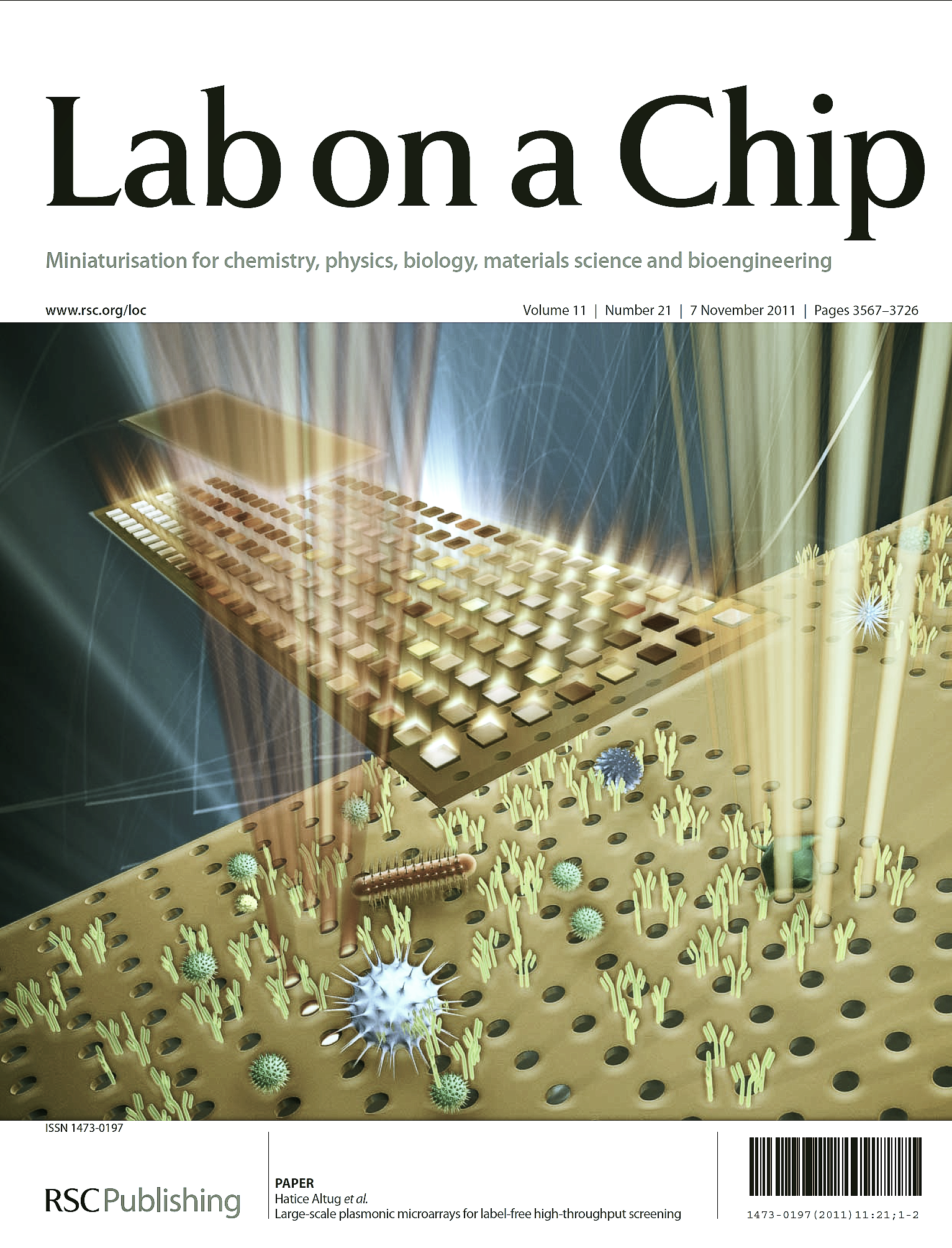 "Large-scale plasmonic microarrays for label-free high-throughput screening" TY Chang, et al., Lab on a Chip 11 (21), 3596-3602 (2011)